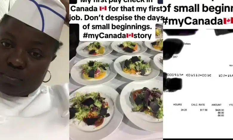 A Nigerian lady sparked a discussion on social media as she shared her humble beginnings and showed off her first paycheck after starting work as a chef in Canada.