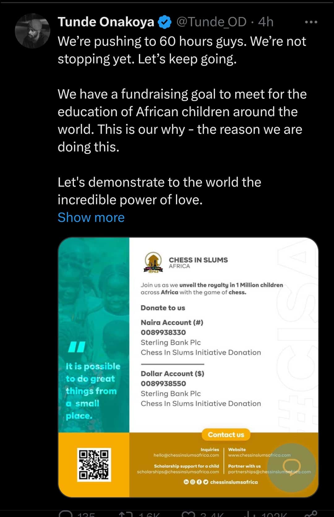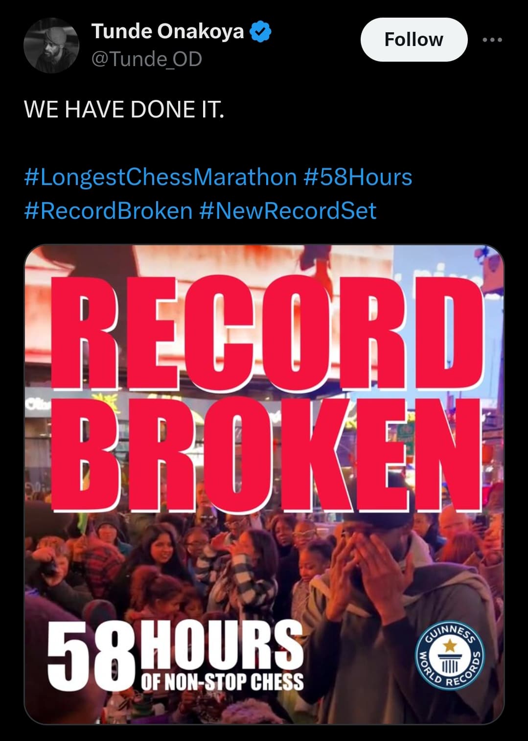 @thatsandragirl The moment Tunde Onakoya clocked the 58th hour 🇳🇬🇳🇬🇳🇬 The current record stands at 56 hours, 9 minutes, and 37 seconds, achieved by Norwegians Hallvard Haug Flatebo and Sjur Ferkingstad in 2018. Tunde is aiming to surpass this record by at least 2 hours. But this isn’t just about breaking records; it’s about shining a global spotlight on Tunde’s impactful work with Chess in Slums Africa (@chessinslums) and raising $1 million to expand access to chess education for millions of children worldwide. Here’s how you can support: 1. Donate to the cause via the link in their bio. 2. Spread the word. Reshare, repost, retweet as many posts about this attempt as possible. 3. Show up at Times Square if you’re in NYC or nearby if you can, he’s currently at 58:13min. You can still show up❤️if you can’t, follow the live update hun. He wants ro add extra two hours to make it 60hours🇳🇬🇳🇬 More enquires for support can be directed to [email protected] or [email protected].? For real-time updates, follow Chess in Slums Africa and @thegiftofchess. #impact #socialimpact