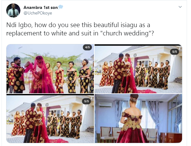 “Ndi Igbo, how do you see this beautiful isiagu as a replacement to white and suit in “church wedding”?”