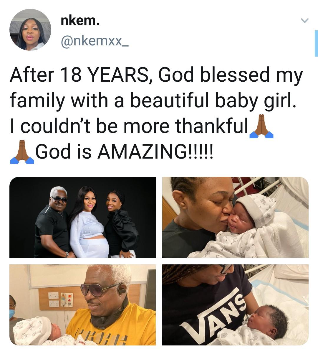 A Nigerian couple have expressed their joy after they welcomed their bundle of joy, a baby girl, 18 years after their first child.