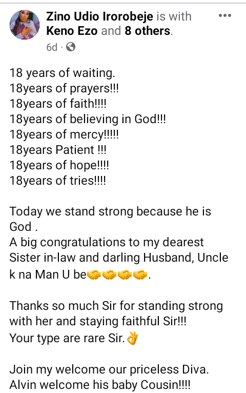 “A big congratulations to my dearest Sister in-law and darling Husband, Uncle k na Man U be. Thanks so much Sir for standing strong with her and staying faithful Sir!!! Your type are rare Sir. Join my welcome our priceless Diva. Alvin welcome his baby Cousin!!!!”.