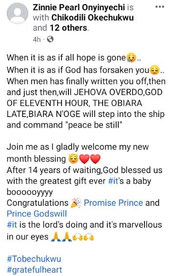 On Sunday, July 2, 2023, the friends and family of Prince Godswill, and his wife, Promise, joyfully shared the special announcement on Facebook as they welcome a child.