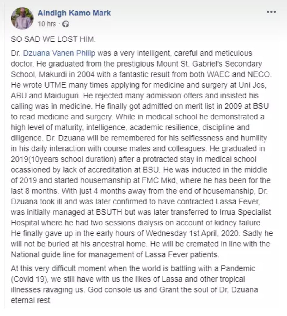 At this very difficult moment when the world is battling with a Pandemic (Covid 19), we still have with us the likes of Lassa and other tropical illnesses ravaging us. God console us and Grant the soul of Dr. Dzuana eternal rest.”