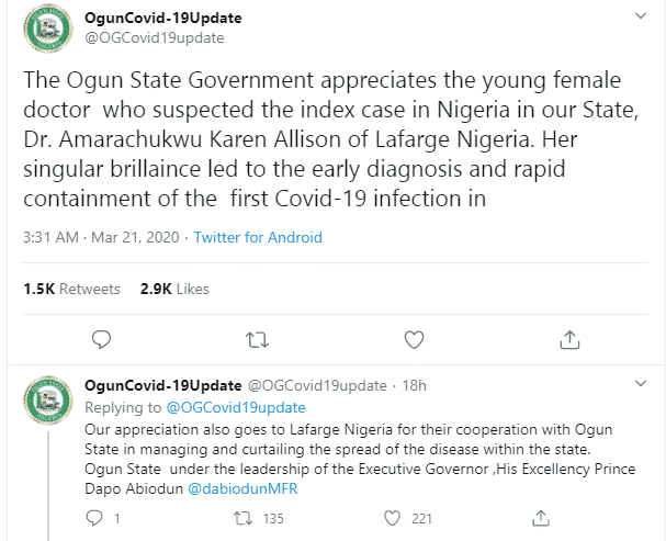 According to the Ogun State Government, the singular brilliance of the young doctor who works with Lafarge Cement Company led to the early diagnosis and rapid containment of the first Covid-19 infection in Nigeria.