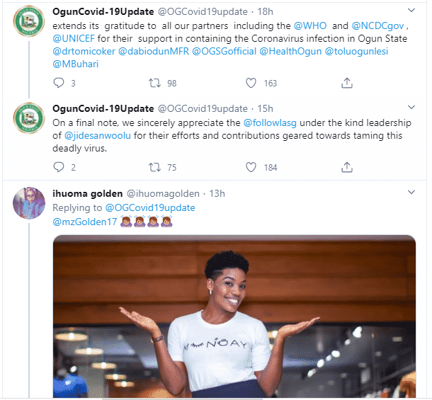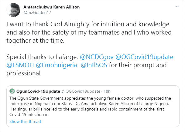 In its appreciation tweets, the Ogun State Government identified the young woman as Dr Amarachukwu Karen Allison.