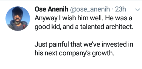 “Anyway I wish him well. He was a good kid, and a talented architect. Just painful that we’ve invested in his next company’s growth.”