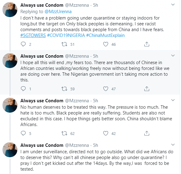 I don’t have a problem going under quarantine or staying indoors for long,but the target on Only black peoples is demeaning. I see racist comments and posts towards black people from China and I have fears. #5GTOWERS #COVID19NIGERIA #ChinaMustExplain