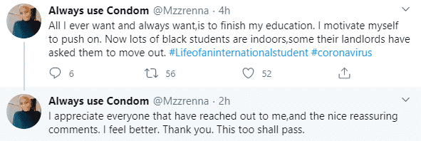 All I ever want and always want,is to finish my education. I motivate myself to push on. Now lots of black students are indoors,some their landlords have asked them to move out. #Lifeofaninternationalstudent #coronavirus