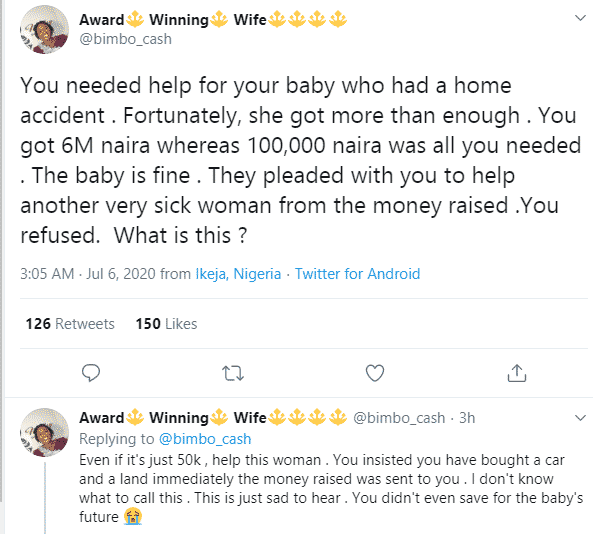 A Twitter user with the handle @bimbo_cash has called out a lady for refusing to save the life of another person after Nigerians contributed N6m to save her child who needed N100k for treatment.