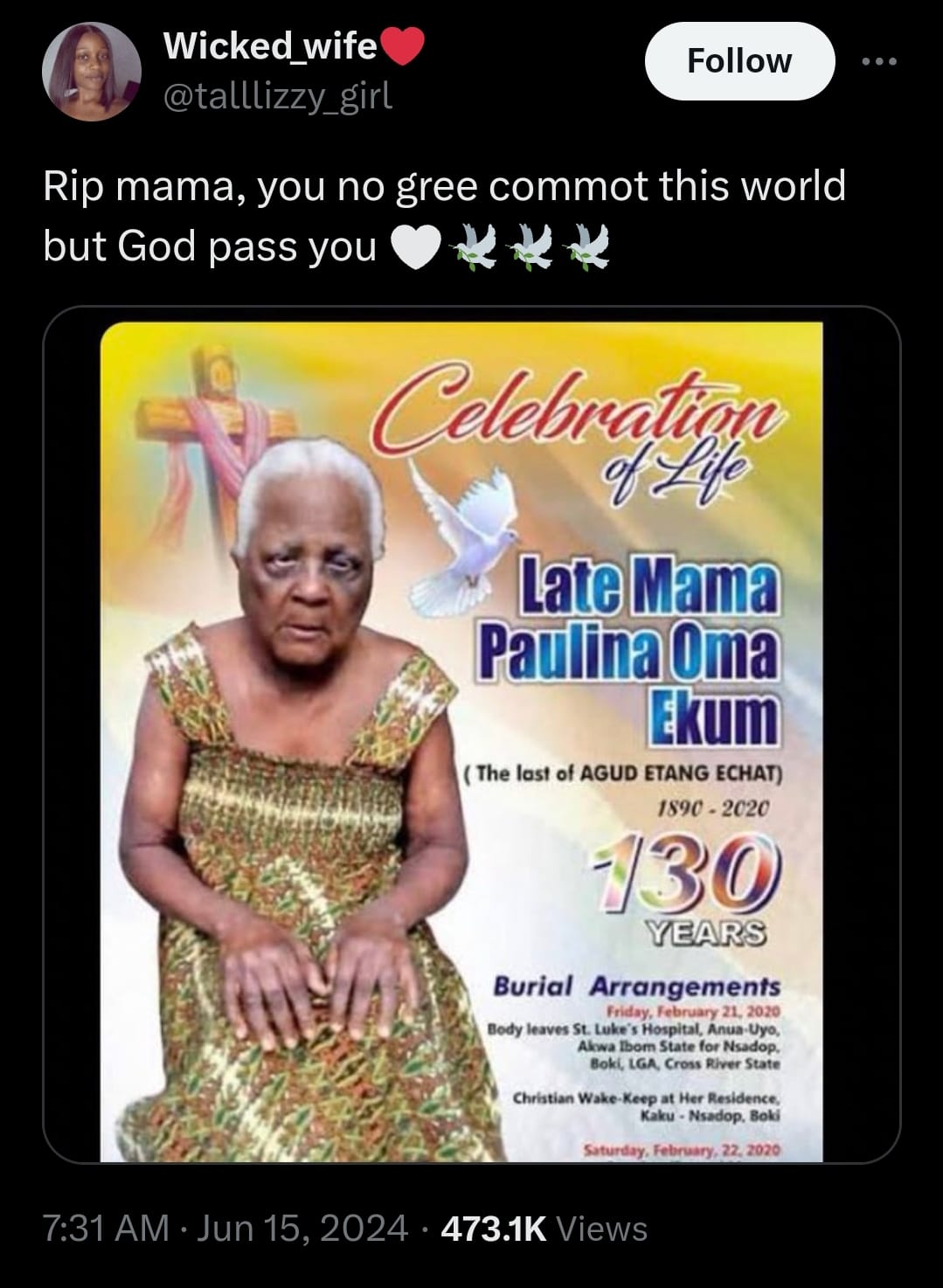 A Nigerian lady mourns her 130-year-old grandmother, who passed away, expressing her faith in God’s will surpassing her grandmother‘s desire to stay in this world.