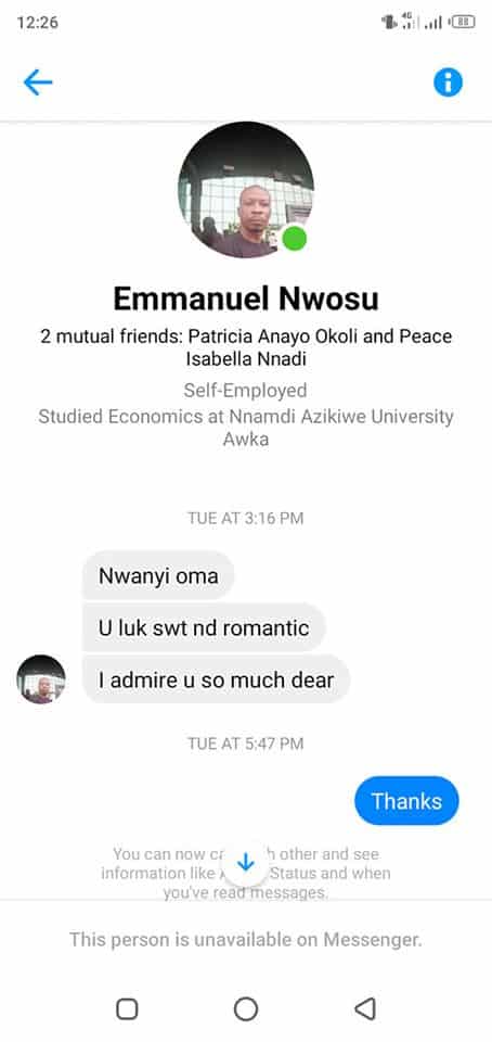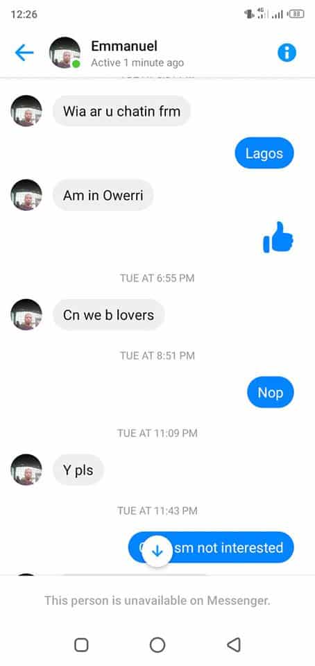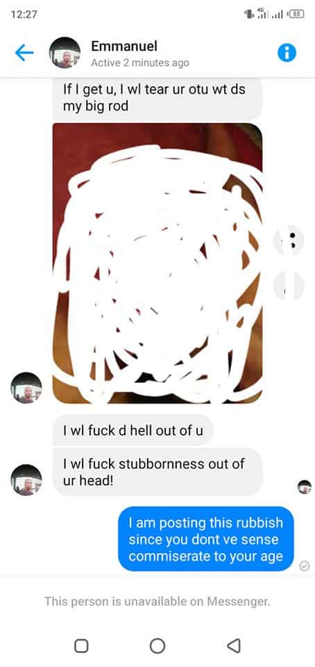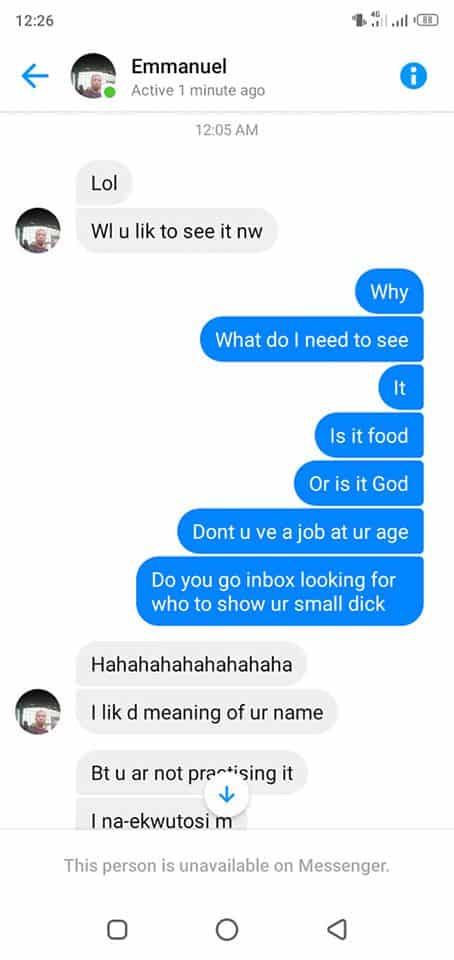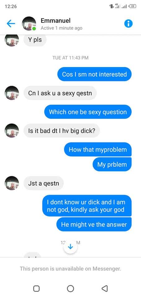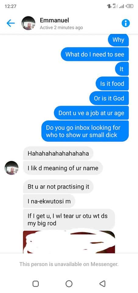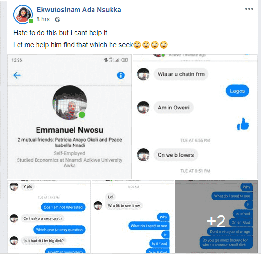 From screenshots of chats shared, the Nigerian man identified as Emmanuel Nwosu sent the photos even after the lady turned down his move for a romantic relatinship.