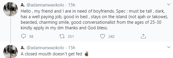 ”Hello , my friend and I are in need of boyfriends. Spec : must be tall , dark, has a well paying job, good in bed , stays on the island (not ajah or lakowe), bearded, charming smile, good conversationalist from the ages of 25-30 kindly apply in my dm thanks and God bless.” her tweet read