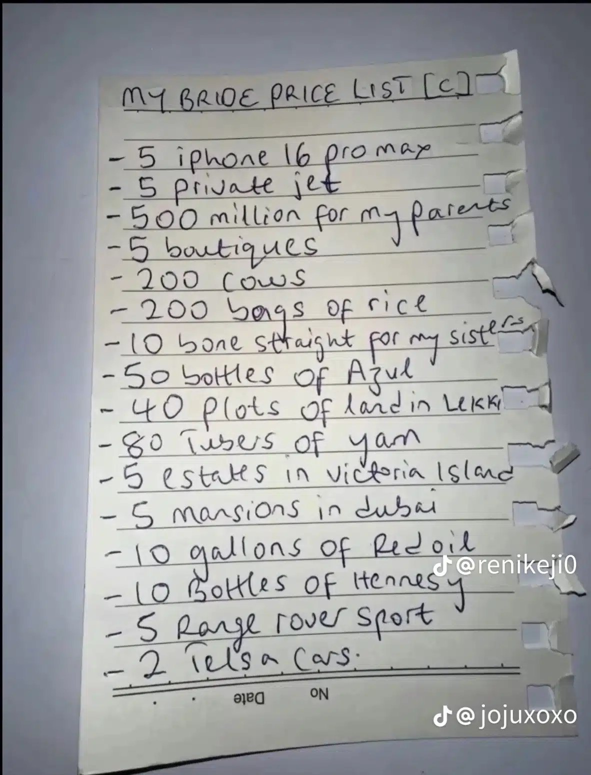 A Nigerian lady breaks the internet as she includes 5 mansions in Dubai, 200 bags of rice, 5 private jets, 2 Tesla cars, 200 cows, 5 iPhone 16 Pro Max, and many other items in her bride price list.