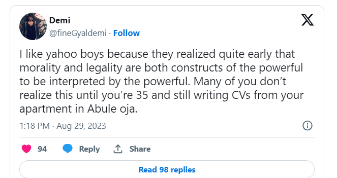 I like yahoo boys because they realized quite early that morality and legality are both constructs of the powerful to be interpreted by the powerful. Many of you don’t realize this until you’re 35 and still writing CVs from your apartment in Abule oja.