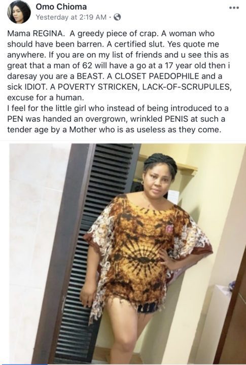 “Mama REGINA. A greedy piece of crap. A woman who should have been barren. A certified slut. Yes quote me anywhere. If you are on my list of friends and u see this as great that a man of 62 will have a go at a 17 year old then i daresay you are a BEAST. A CLOSET PAEDOPHILE and a sick IDIOT.