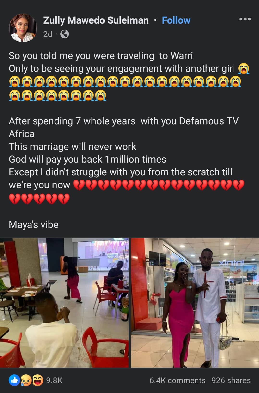 “After spending 7 whole years with you, Defamous TV Africa, this marriage will never work. God will pay you back 1 million times. Except I didn’t struggle with you from scratch to where you are now 💔💔💔💔💔💔💔💔💔💔💔💔💔💔💔💔💔💔💔.”