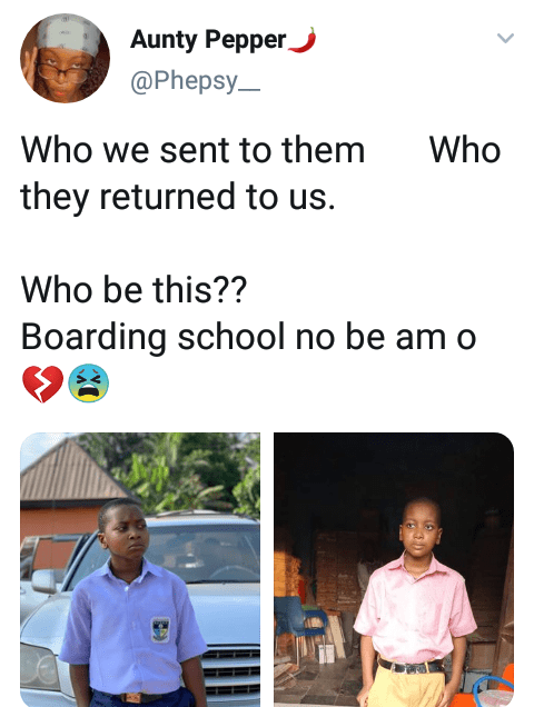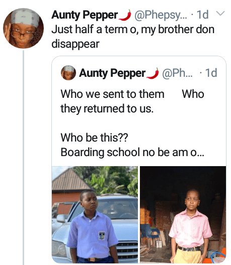 Taking to Twitter on Friday, Aunty Pepper (@Phepsy) shared a photo of her brother the day they took him to boarding school and that of when he returned two months later.