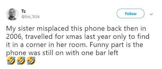 “My sister misplaced this phone back then in 2006, travelled for xmas last year only to find it in a corner in her room. Funny part is the phone was still on with one bar left.”