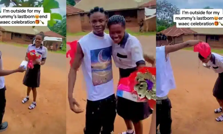 The caption reads: “I’m outside for my mummy’s last born’s end WAEC celebration.”