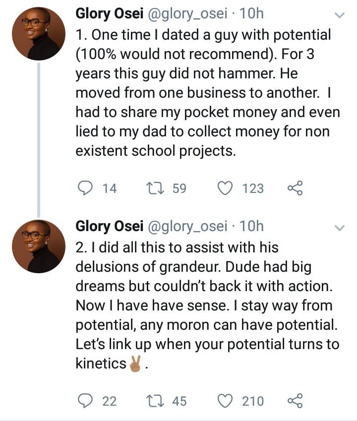 @glory_osei tweeted: “1. One time I dated a guy with potential (100% would not recommend). For 3 years this guy did not hammer. He moved from one business to another. I had to share my pocket money and even lied to my dad to collect money for non existent school projects.”