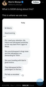@ManuelX9999: “Sometime two months ago on this app i saw a complain about GIGM passengers being kidnapped and driver escaping and nothing was done. This needs Investigation.”