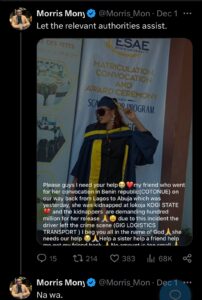 Nigerian lady kidnapped after convocation in Benin Republic, kidnappers demand ₦100m