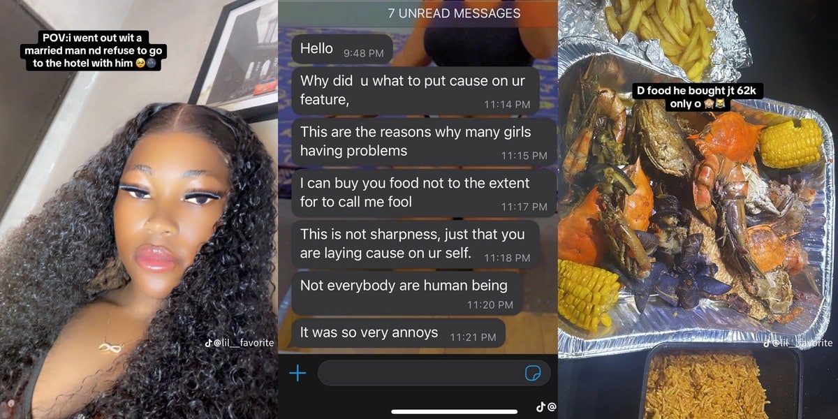 A Nigerian lady has triggered reactions on social media by sharing a message she received from a married man after she refused to go to a hotel with him following their lunch date.
