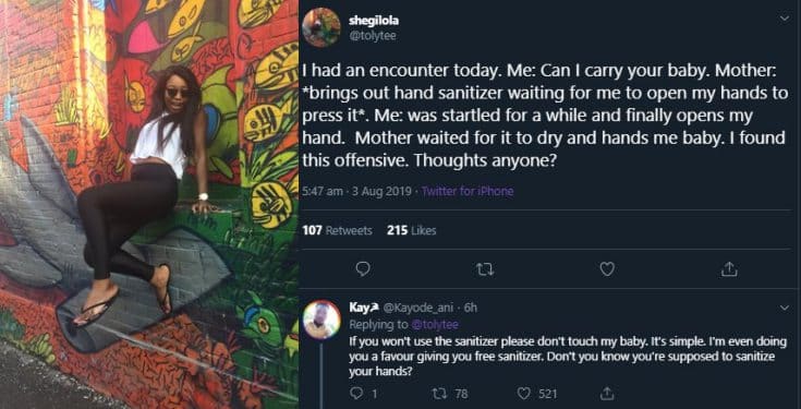 “I had an encounter today. Me: Can I carry your baby. Mother: *brings out hand sanitizer waiting for me to open my hands to press it*. Me: was startled for a while and finally opens my hand. Mother waited for it to dry and hands me baby. I found this offensive. Thoughts anyone?”, she tweeted