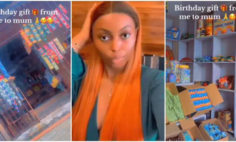 Nigerian lady melts hearts as she gifts her mother a mini supermarket on her birthday (Video)