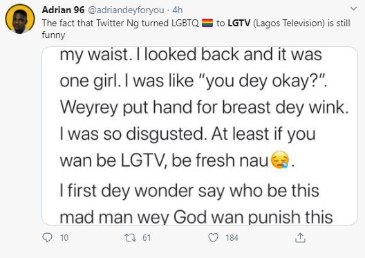 “Weyrey put hand for breast dey wink. I was so disgusted. At least if you wan be LGTV, be fresh nau.