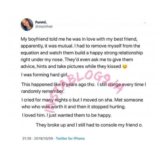 The lady revealed that her boyfriend at the time had come to her to confess that he was in love with her bestfriend. She found out later that the friend too also felt the same way for her boyfriend.