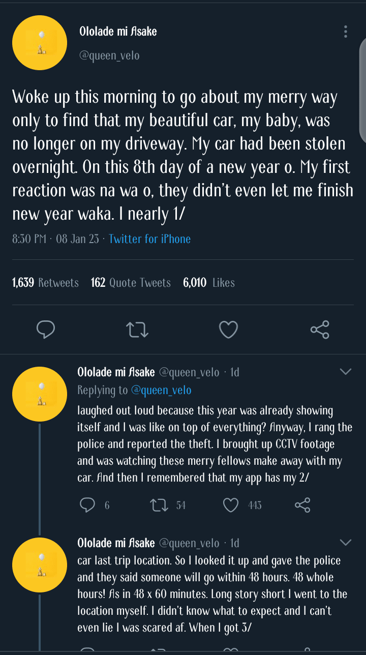 “Woke up this morning to go about my merry way only to find that my beautiful car, my baby, was no longer on my driveway. My car had been stolen overnight. On this 8th day of a new year o. My first reaction was na wa o, they didn’t even let me finish new year waka.