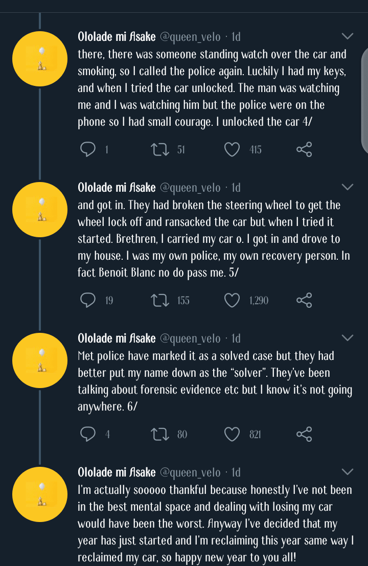 “I’m actually sooooo thankful because honestly I’ve not been in the best mental space and dealing with losing my car would have been the worst. Anyway I’ve decided that my year has just started and I’m reclaiming this year same way I reclaimed my car, so happy new year to you all!”