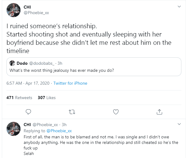 “I ruined someone’s relationship. Started shooting shot and eventually sleeping with her boyfriend because she didn’t let me rest about him on the timeline