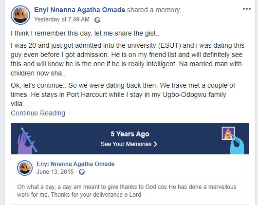 I was 20 and just got admitted into the university (ESUT) and i was dating this guy even before I got admission. He is on my friend list and will definitely see this and will know he is the one if he is really intelligent. Na married man with children now sha..