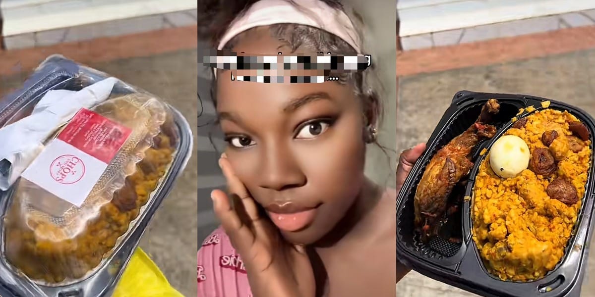 A Nigerian lady has sparked a discussion on social media by flaunting a portion of Banga rice, plantain, and fried chicken that she reportedly ordered for a total of ₦150k.