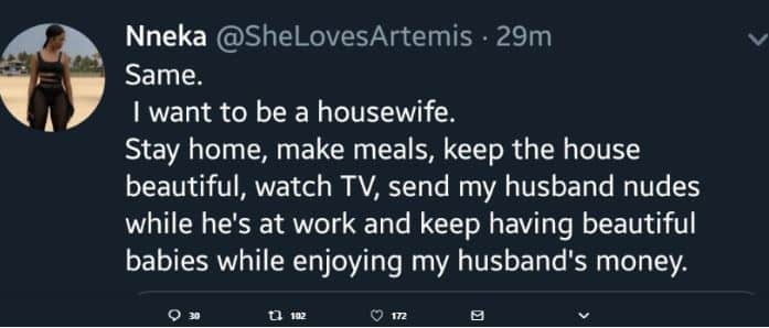 She wrote: “I want to be a housewife. Stay home, make meals, keep the house beautiful, watch TV, send my husband nudes while he’s at work and keep having beautiful babies while enjoying my husband’s money.”