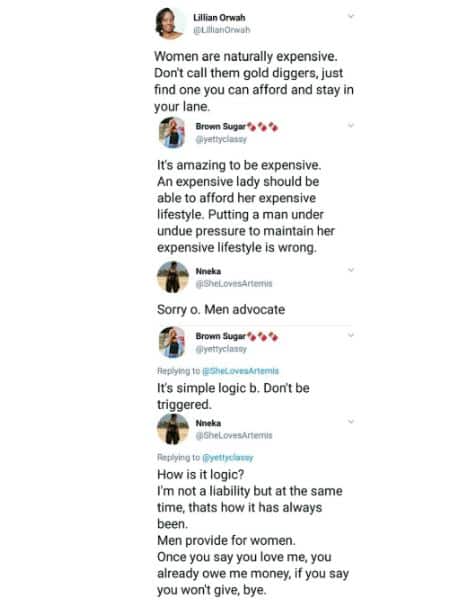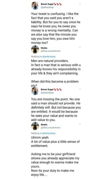 But another woman stepped in to say a man must spend on the woman he loves. @She LovesArtemis said, “men must provide for women. Once you say you love me, you already owe me money.”