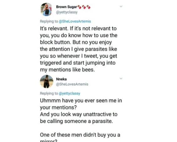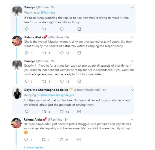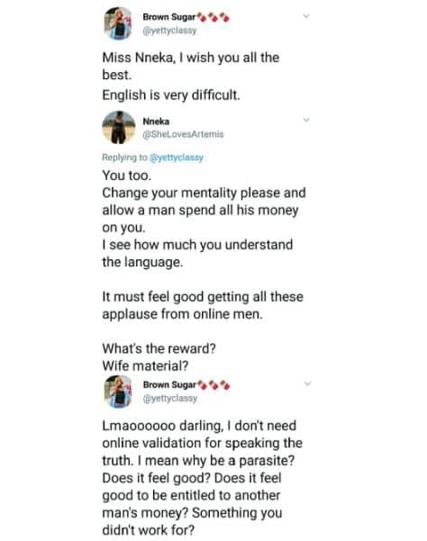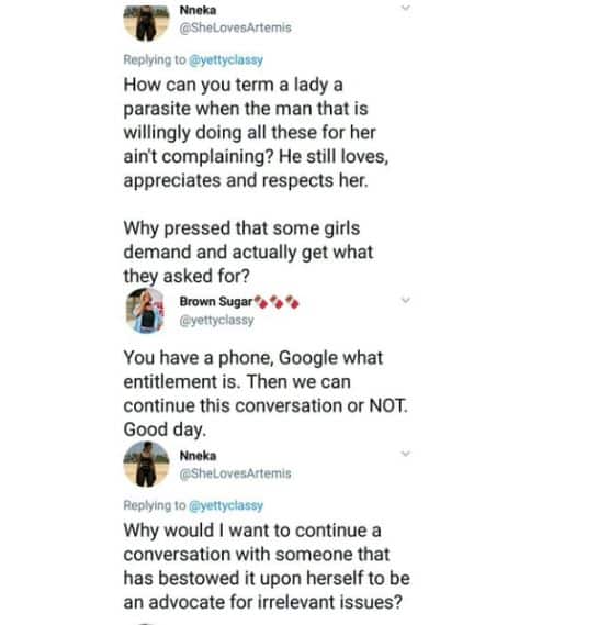 Another female Twitter user, with the handle @Yettyclassy, replied saying it is wrong to feel entitled to a man’s money, especially if you didn’t work for it with him.