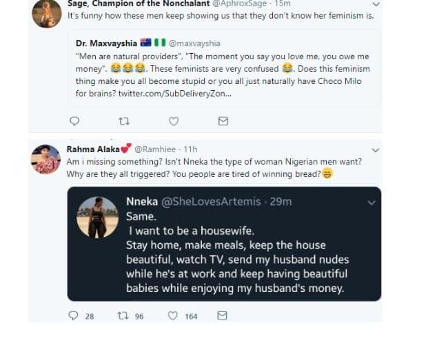 But the Twitter outrage began after @She LovesArtemis tweeted that she intends to be a housewife and just enjoy her husband’s money.