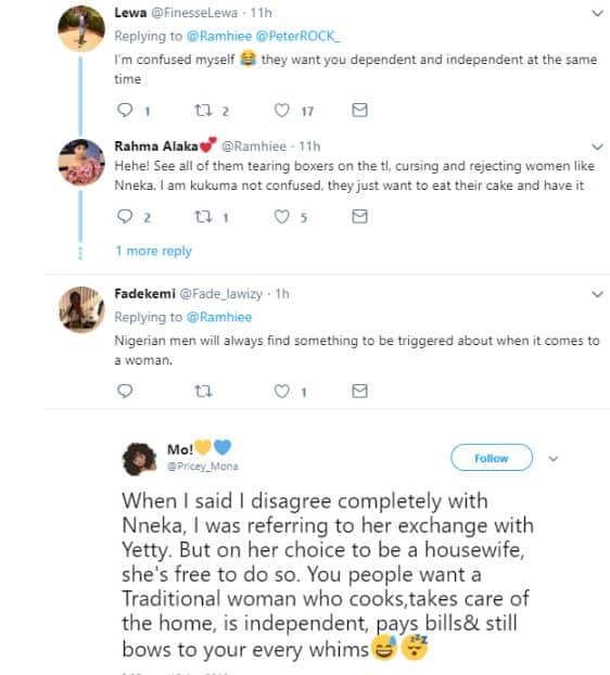 This quickly turned into an argument about gender roles. Some men called the woman a feminist. But some pointed out that she is the traditional African woman and asked men against feminism why they are suddenly complaining about traditional gender roles when it’s time for them to provide.