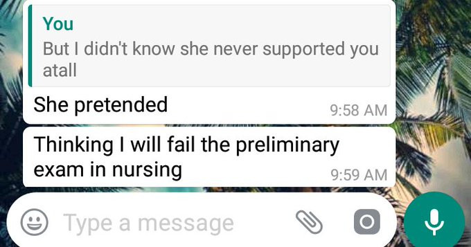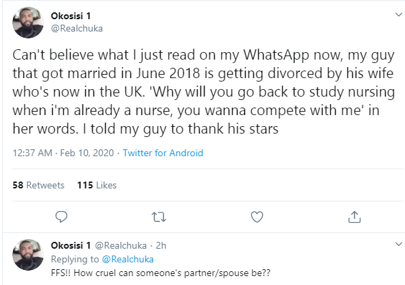 “Can’t believe what I just read on my WhatsApp now, my guy that got married in June 2018 is getting divorced by his wife who’s now in the UK. ‘Why will you go back to study nursing when i’m already a nurse, you wanna compete with me’ in her words. I told my guy to thank his stars FFS!! How cruel can someone’s partner/spouse be??”