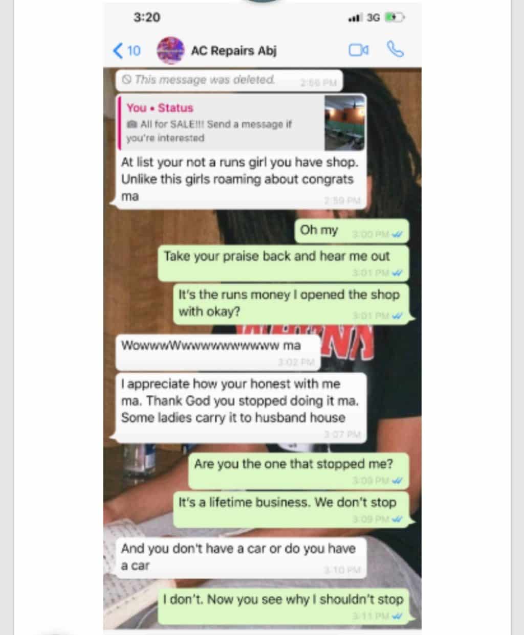 However, the woman wasn’t pleased with the way he shamed other women, so she played on his senses, saying she’s also a runs girl and she used ‘runs’ to open a shop.