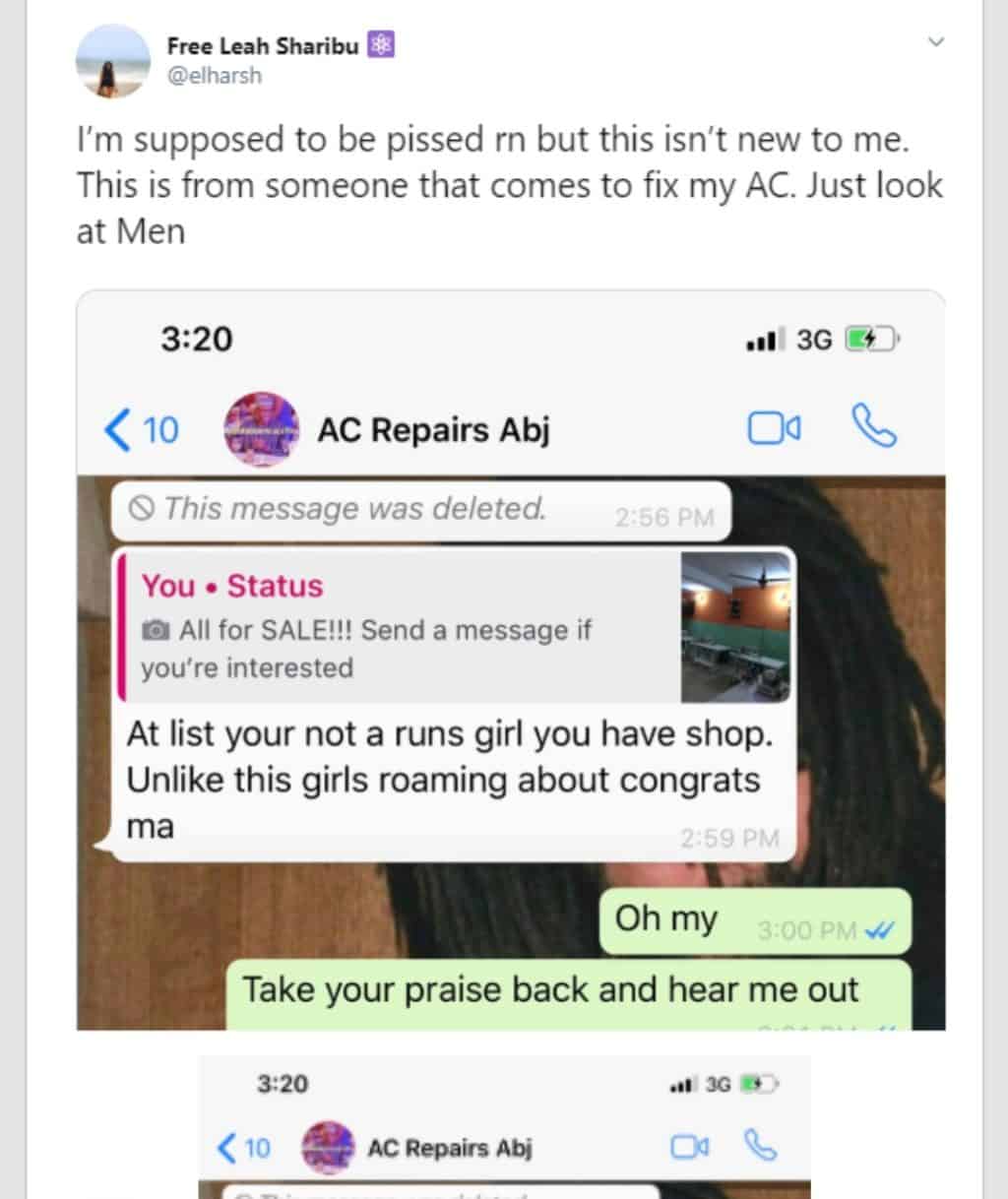 A Nigerian lady identified as @elharsh on Twitter has narrated her experience with an AC repairer who she invited over for a job.