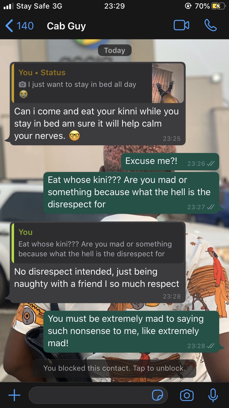 In the screenshot, the lady posted a photo of her laps on her Whatsapp status and her cab driver replied, saying, “Can I come and eat your kinni while you stay in bed am sure it will help calm your nerves”