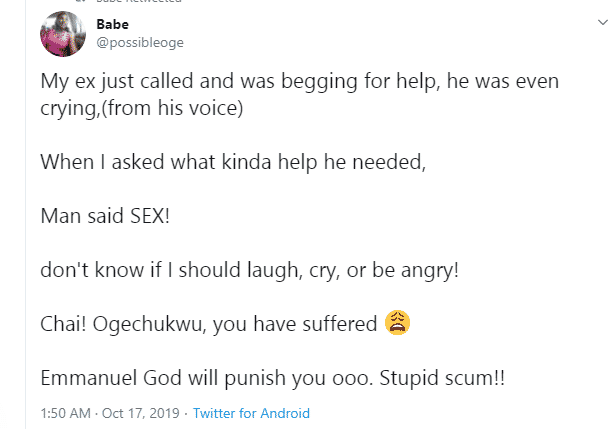 @PossibleOge said she got to know that the help her ex-boyfriend who she identified as Emmanuel needed was sex, after a little push. She revealed that the text message left her with mixed emotion.