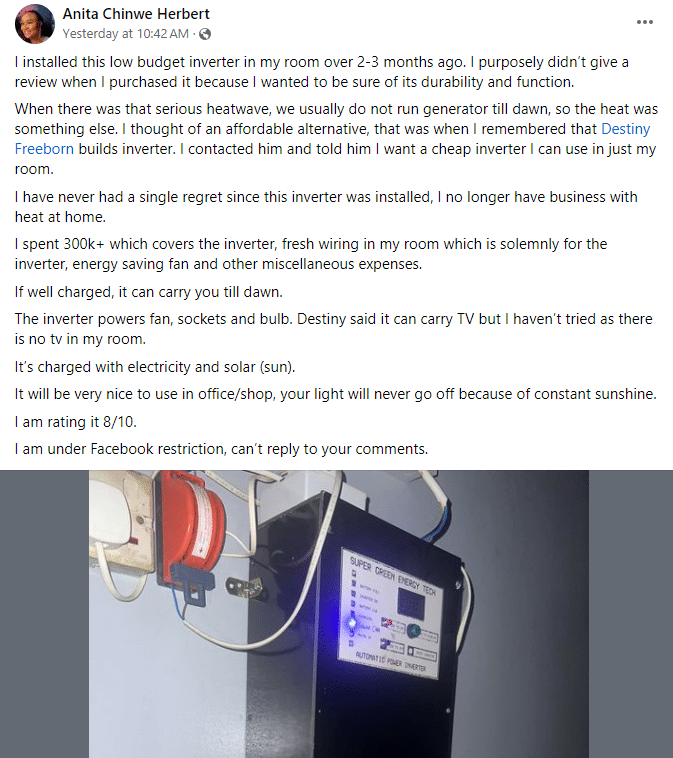 In her Facebook post, Chinwe described how the solar inverter has become an indispensable part of her household, particularly during nighttime power interruptions.