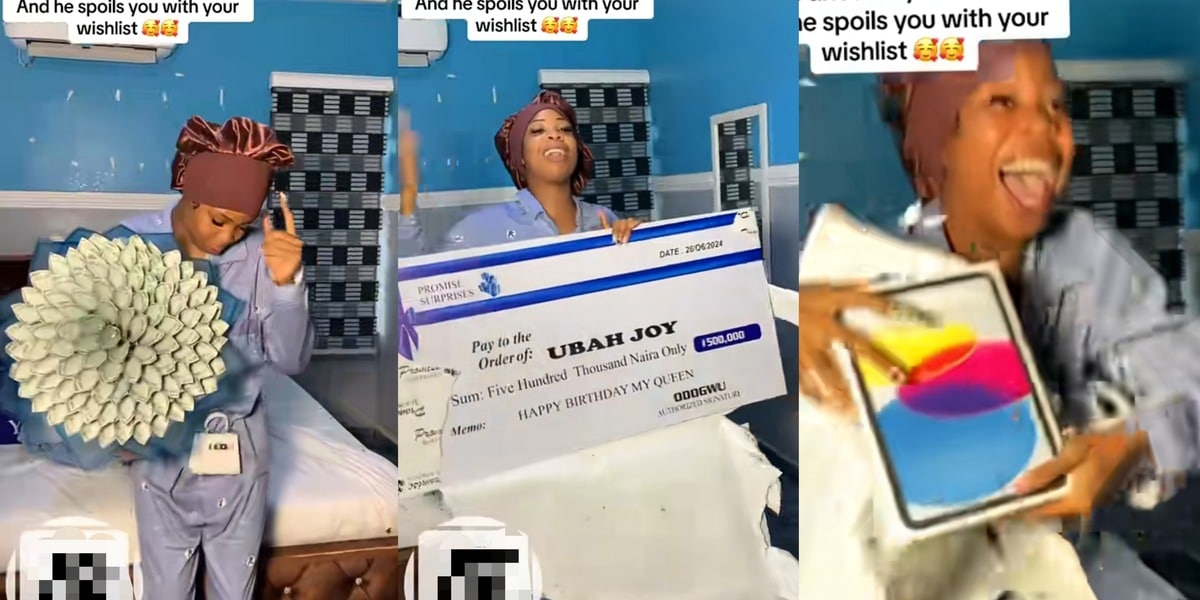A Nigerian lady sparked a discussion on social media as her boyfriend gifted her a money bouquet, cake, brand new iPad, and ₦500k cash to mark their one year of dating.