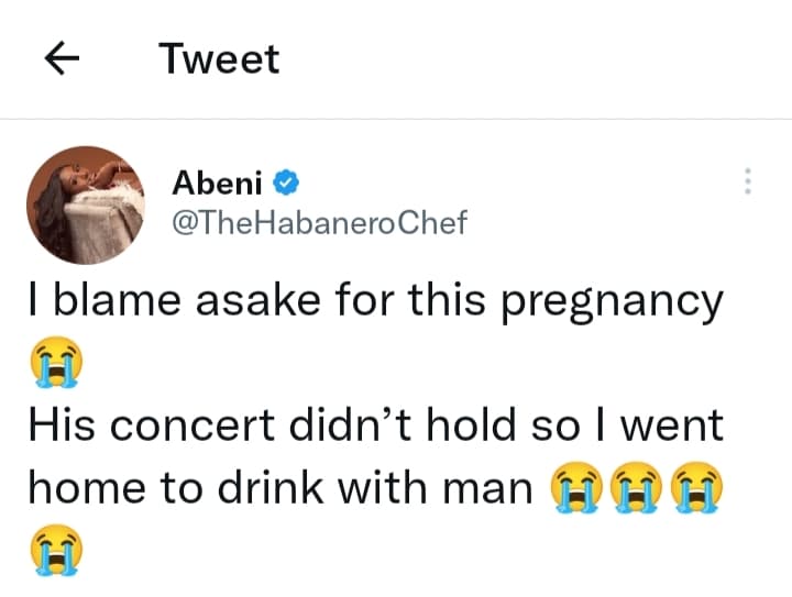 “I blame Asake for this pregnancy. His concert didn’t hold so I went home to drink with man”, she said.