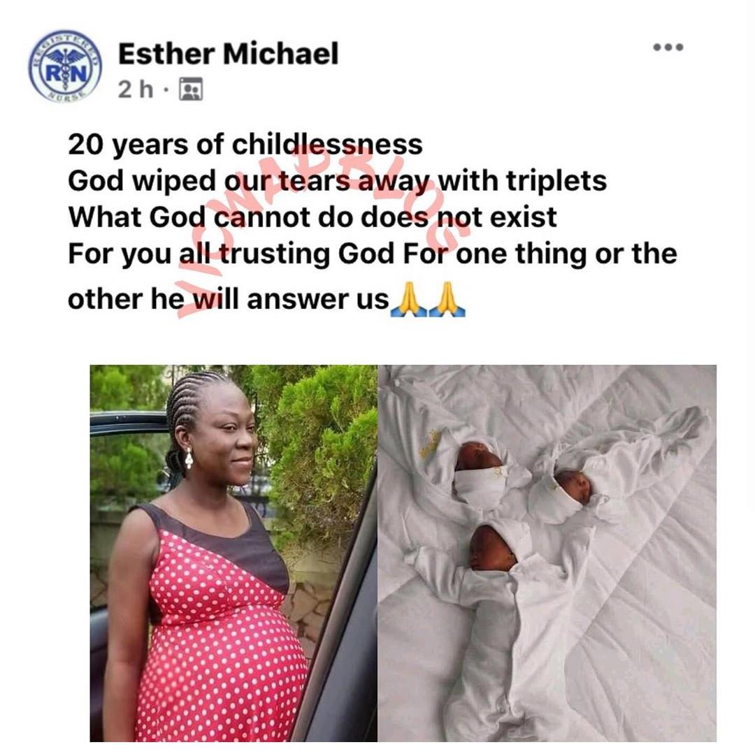 The proud mother identified as Esther Michael took to Facebook to share the good news with her friends, while thanking God for wiping away their sorrows after 20 years.
